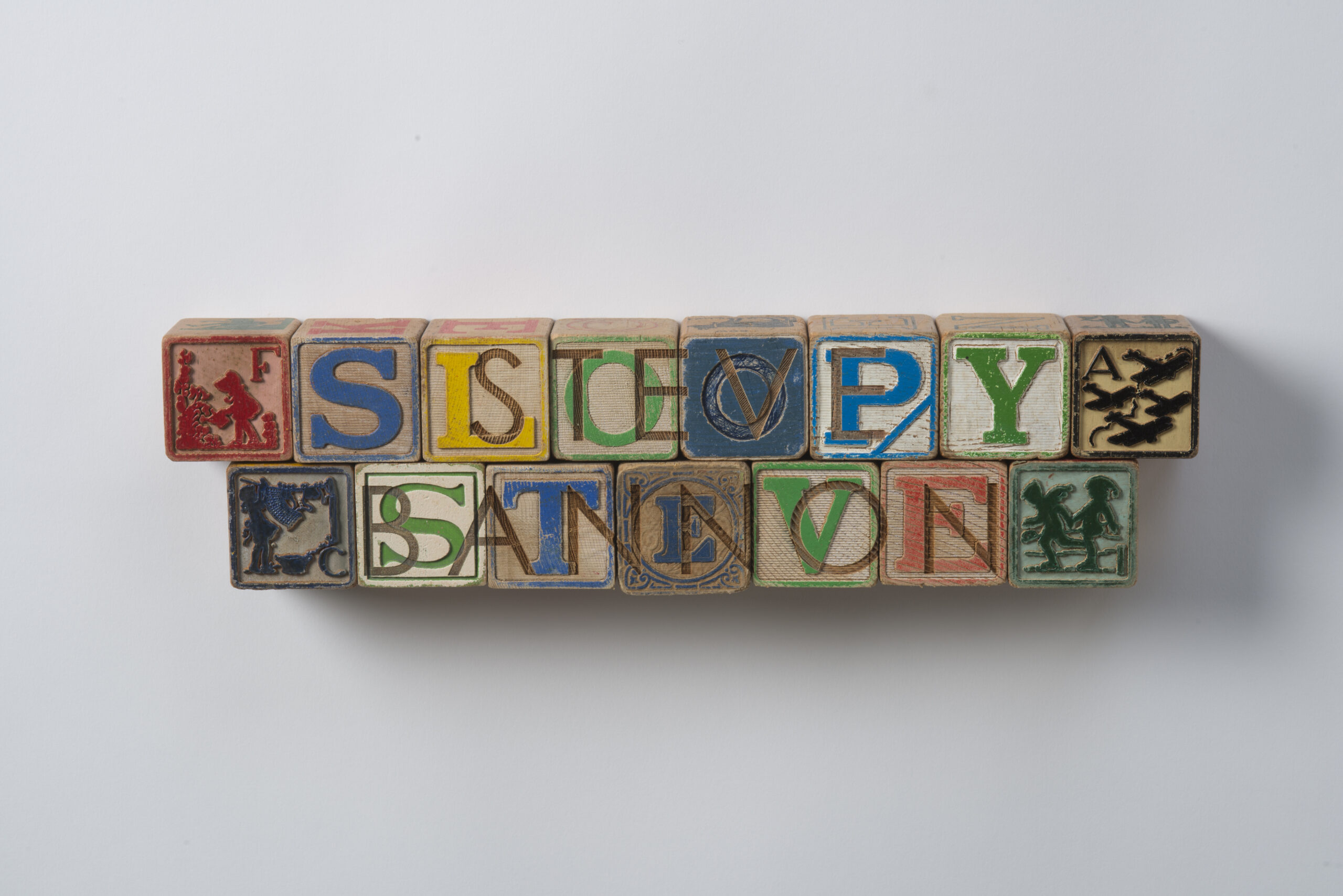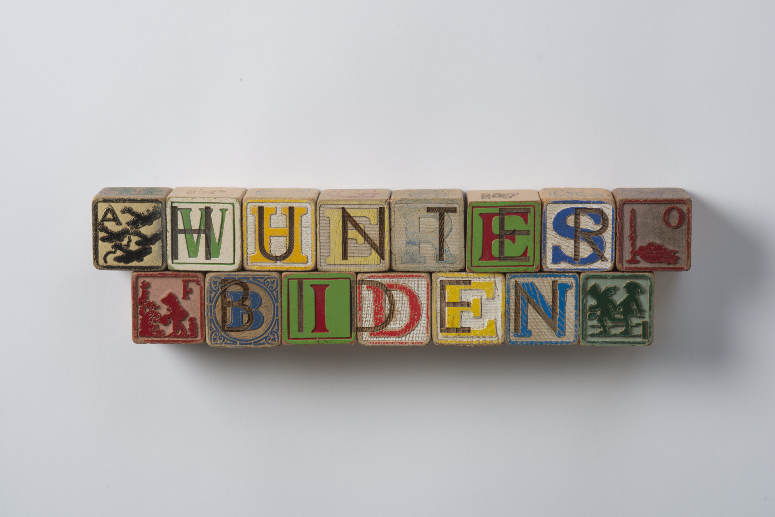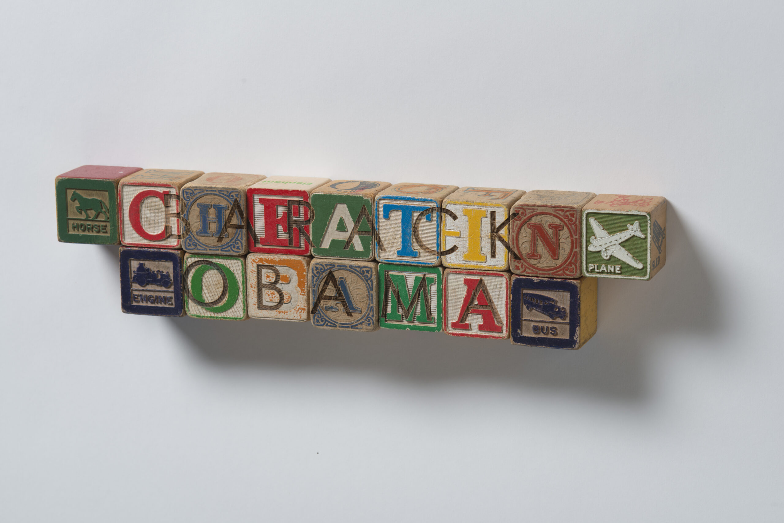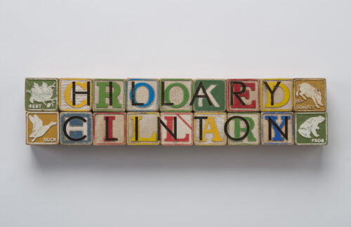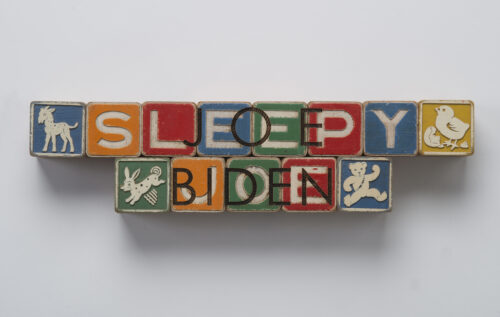 During the 2016 Republican primaries, Donald Trump gave nicknames to all his major opponents in an attempt to trivialize and demonize them. Throughout his presidency, Trump has continued to use this strategy against anyone he perceives as a threat. Here, children’s alphabet blocks are arranged to spell out names he has coined for his opponents. Atop these arrangements I have laser engraved the true name of each individual (e.g. Pocahontas – Elizabeth Warren); truth will prevail, leaving its mark on the lies and exaggerations framed by Trump.